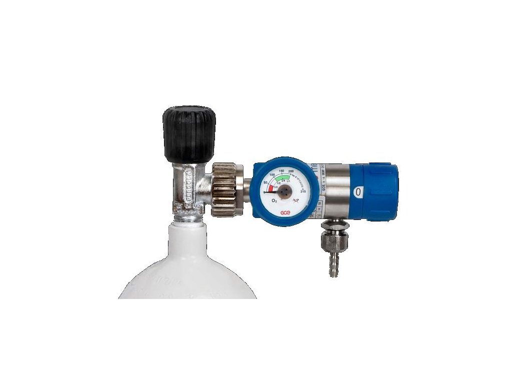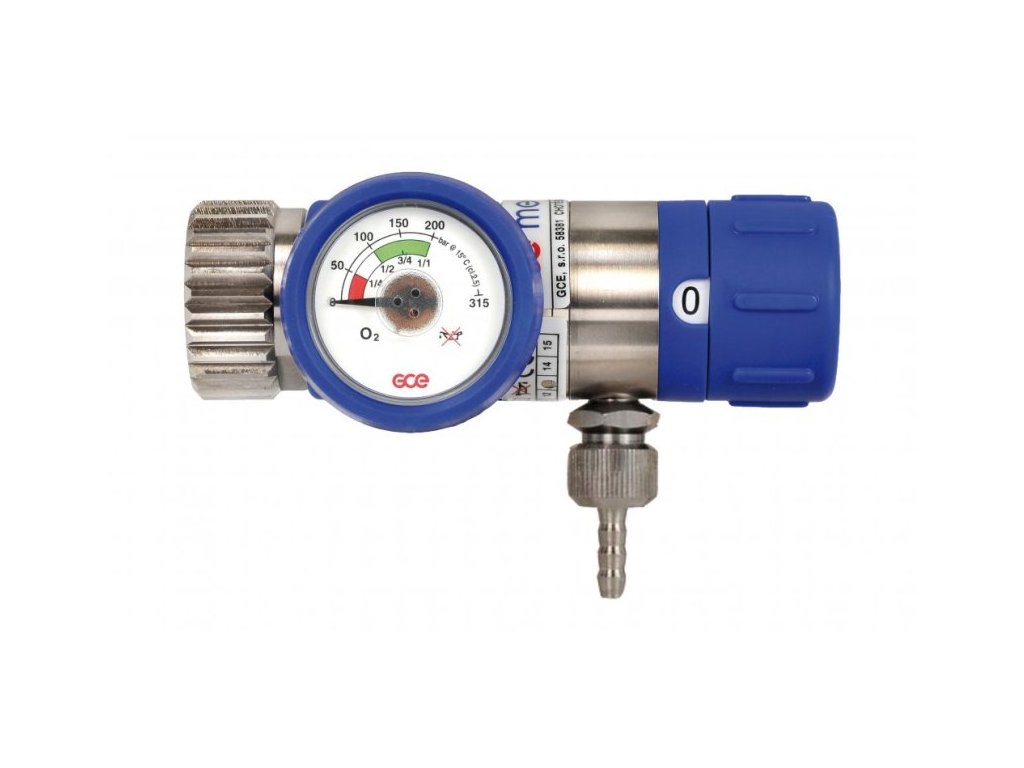 Manometr je otočný o 360° a dovoluje tak snadnou kontrolu tlaku plynu v lahvi a zárověň zlepšuje připojení kyslíkové kanyly nebo polomasky a předchází tím zkroucení hadičky.