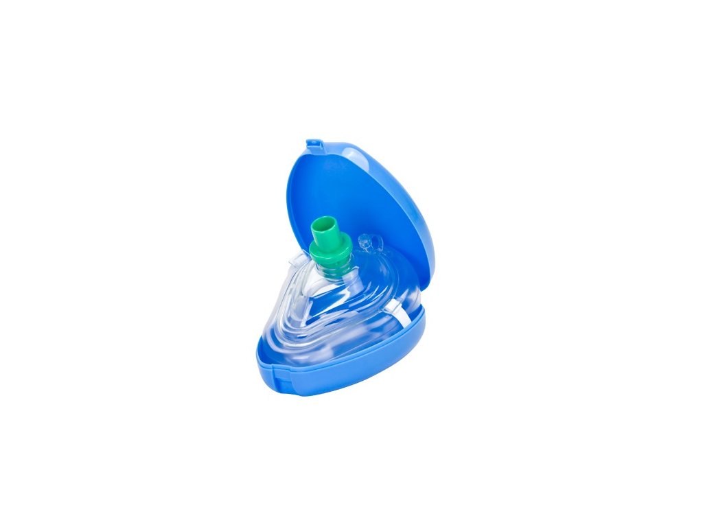 Resuscitační kapesní dýchací maska se dvěmi jednocestnými ventily. Transparentní ventil je určen k použití