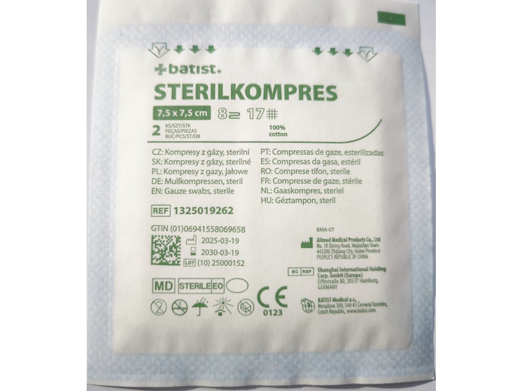 Sterilní krytí STERILKOMPRES se používá k všestrannému ošetření - k čištění ran, ke krytí ran a k absorpci tělesných tekutin. Kompresy jsou měkké, savé, prodyšné, nepřilnavé a skládané v 8 vrstvách. Okraje řezu jsou založené směrem dovnitř, takže nedochází k jejich třepení a zanášení nitek do rány. Sterilní krytí o rozměrech 7,5 cm x 7,5 cm je vyrobeno ze 100% bavlněných vláken.