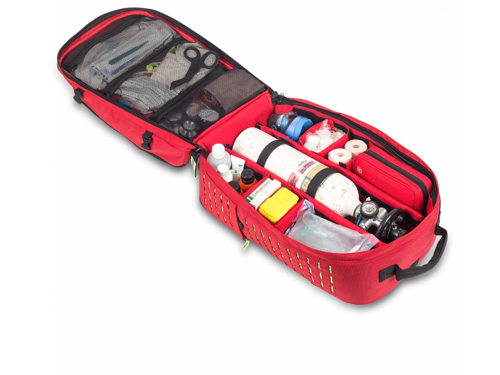 Velká přední kapsa na různé vybavení je rozdělena pomocí odnímatelných přepážek a obsahuje prostor pro bezpečné uložení defibrilátoru, který lze fixovat pomocí dvou elastickým pásů.