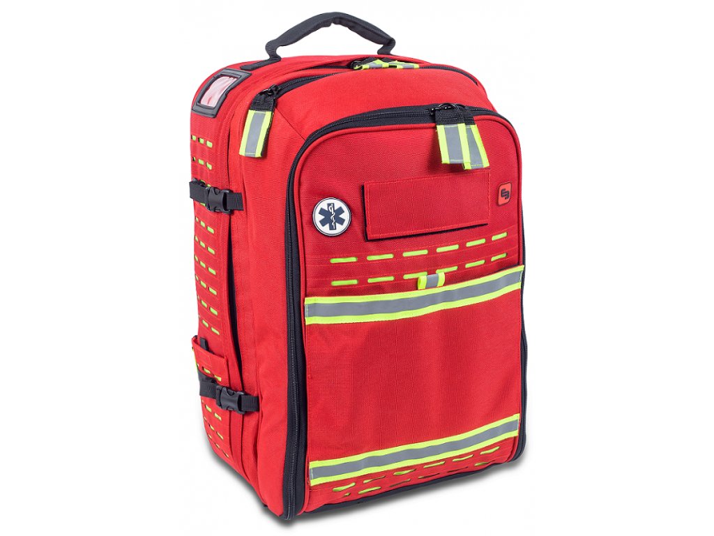 Velký zdravotnický batoh do terénu pro záchranáře s krytou transparentní čelní kapsou na AED defibrilátor.